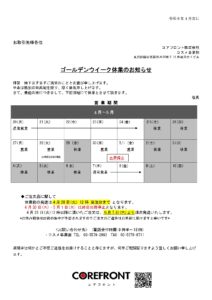 【GWの営業日程】4月29日、5月2~6日は休業いたします。